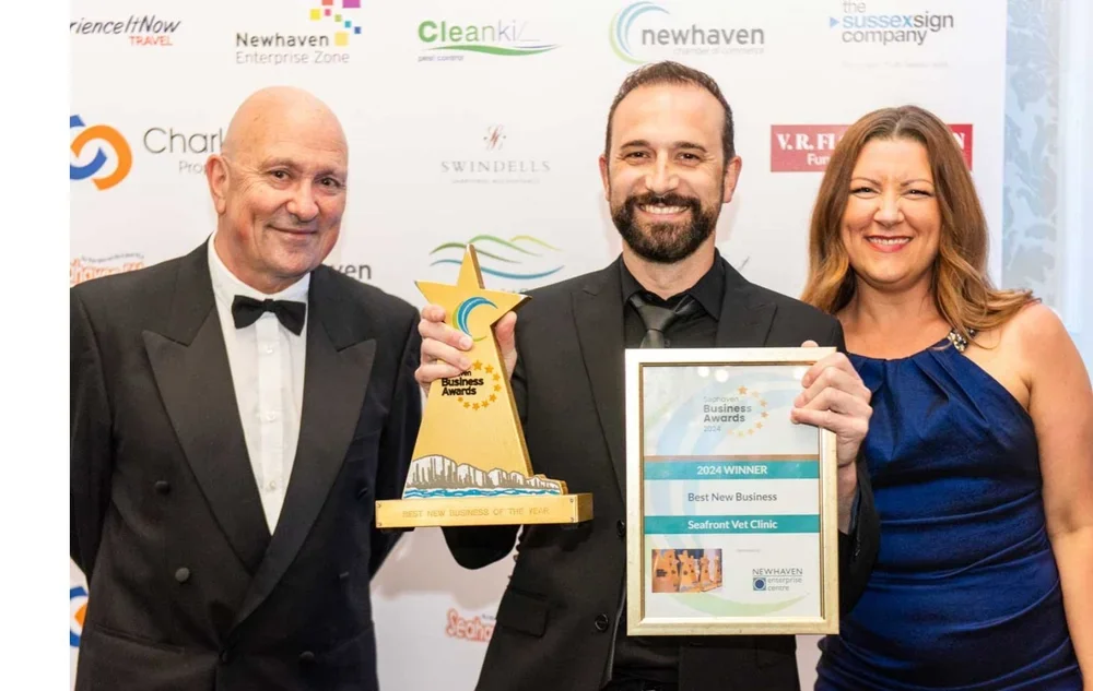 Pictured: David Snell and Nicola Lee from Newhaven Enterprise Centre and Let’s Do Business Group presenting winner of the Best New Business award 2024 to Seafront Vet Clinic.